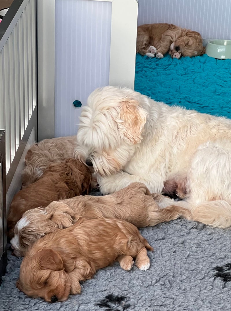 Pommelien is een licht gekleurde echte Australian labradoodle met een mooie wavy fleece vacht. De pupjes uit haar eerste nestje waren allemaal apricot van kleur. Louis is een echte knappert, heeft ook een mooie zwarte dop neus en een zachte wavy fleece vacht net als Pom.